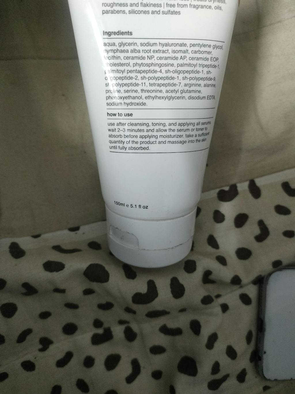 aqua, glycerin, sodium hyaluronate, pentylene glycol, nymphaea alba root extract, isomalt, carbomer, lecithin, ceramide NP, ceramide AP, ceramide EOP, cholesterol, phytosphingosine, palmitoyl tripeptide-1, palmitoyl pentapeptide-4, sh-oligopeptide-1, sh-oligopeptide-2, sh-polypeptide-1, sh-polypeptide-9, sh-polypeptide-11, tetrapeptide-7, arginine, alanine, proline, serine, threonine, acetyl glutamine, phenoxyethanol, ethylhexylglycerin, disodium EDTA, sodium hydroxide.